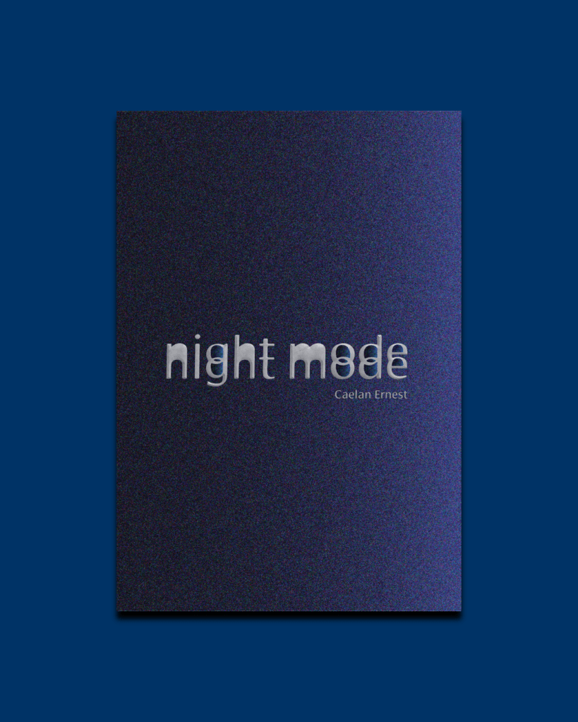 night mode is a book-length serial poem that oscillates between digital and IRL topias, blurring the line between the two. In five poetic sequences and a brief coda, this deeply visceral and darkly erotic book explores themes of abjection, violence, limerence, love, and desire. The speaker navigates shifts in their identity in response to the encounters and exchanges they make, allowing each poem to expand upon the last— rupturing into new formal landscapes that give way for a pastiche wasteland of internet speech and cybernetic bodies. Through music, lyric, fragmentation, and play, night mode is an artifact of exploration and identity.